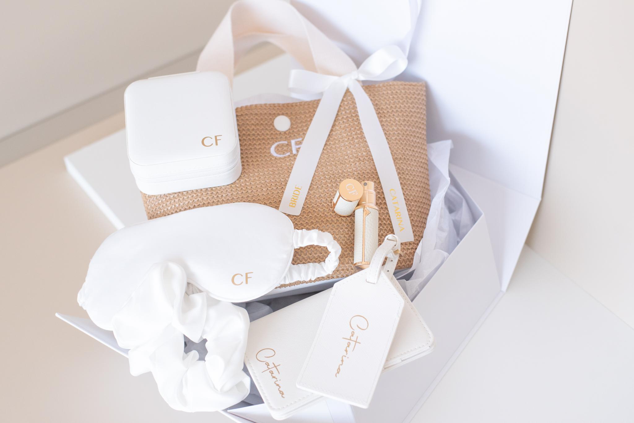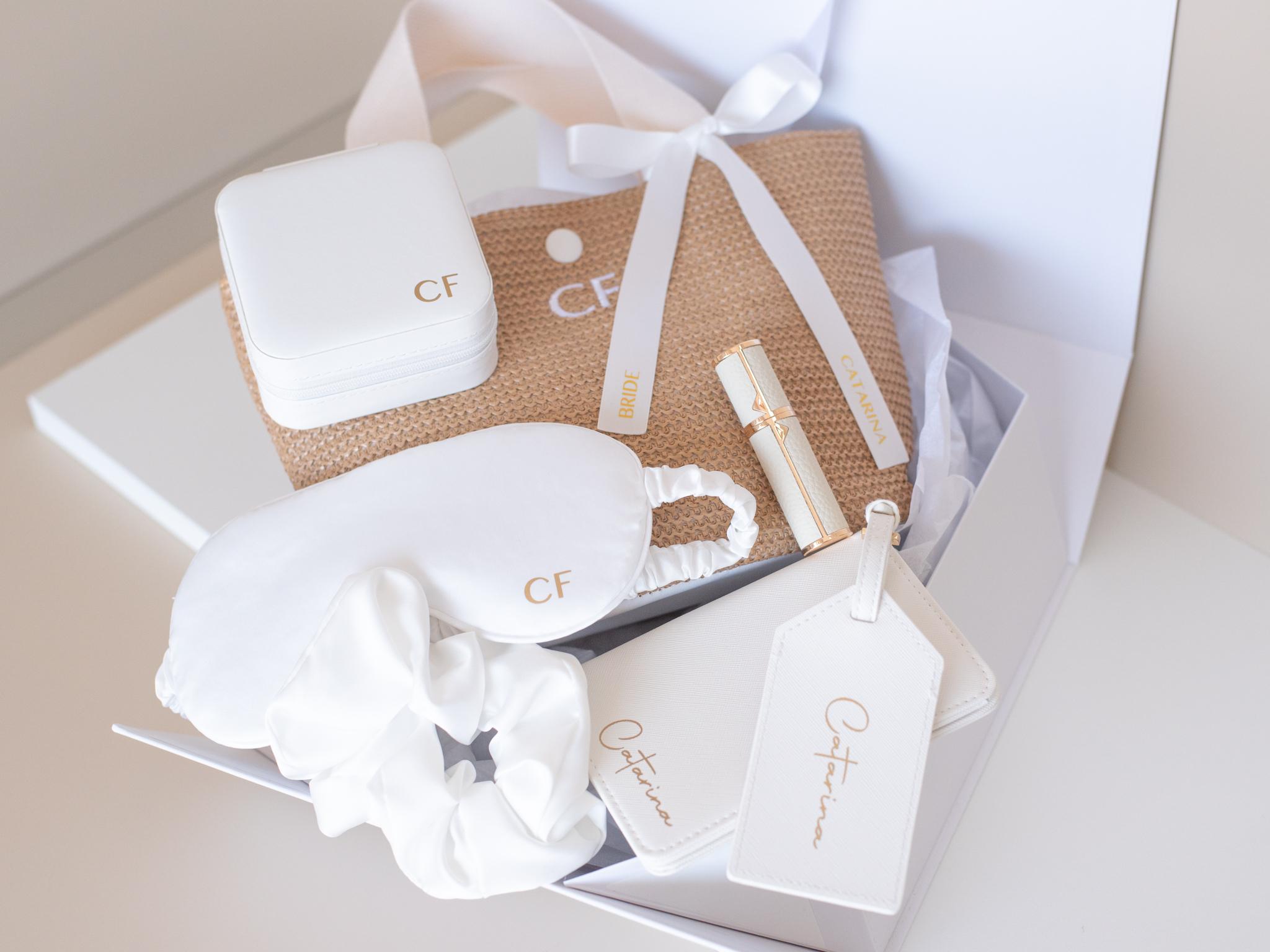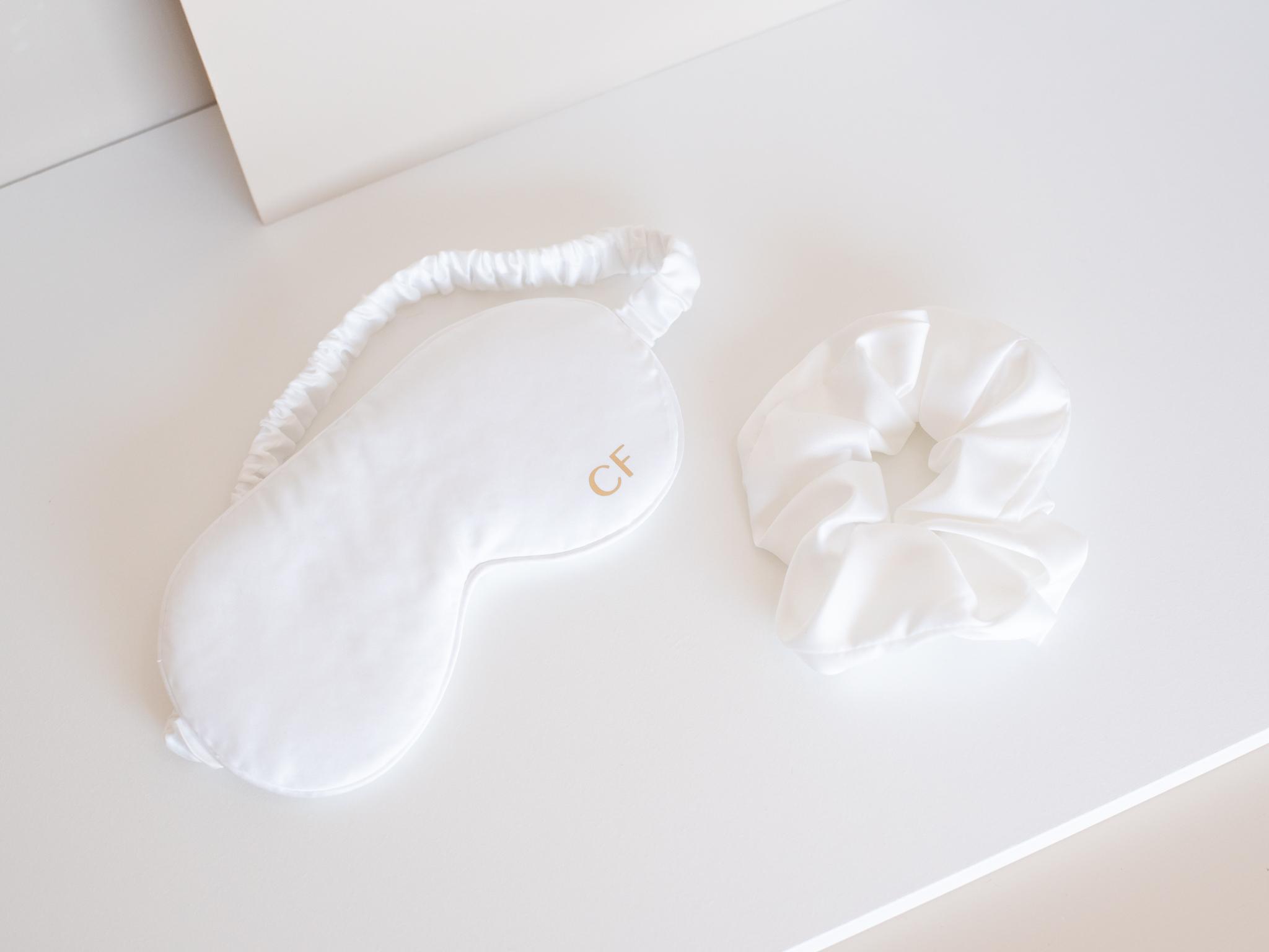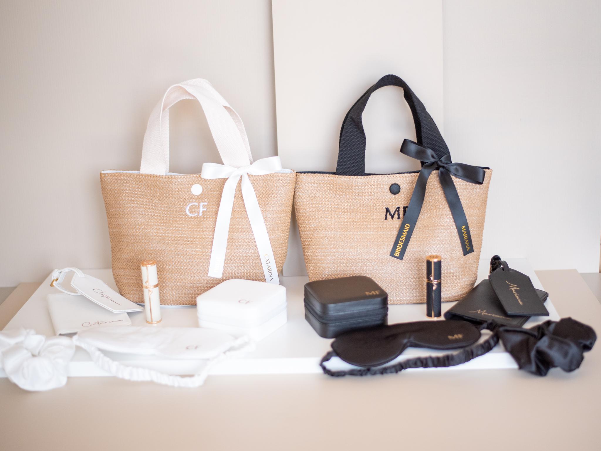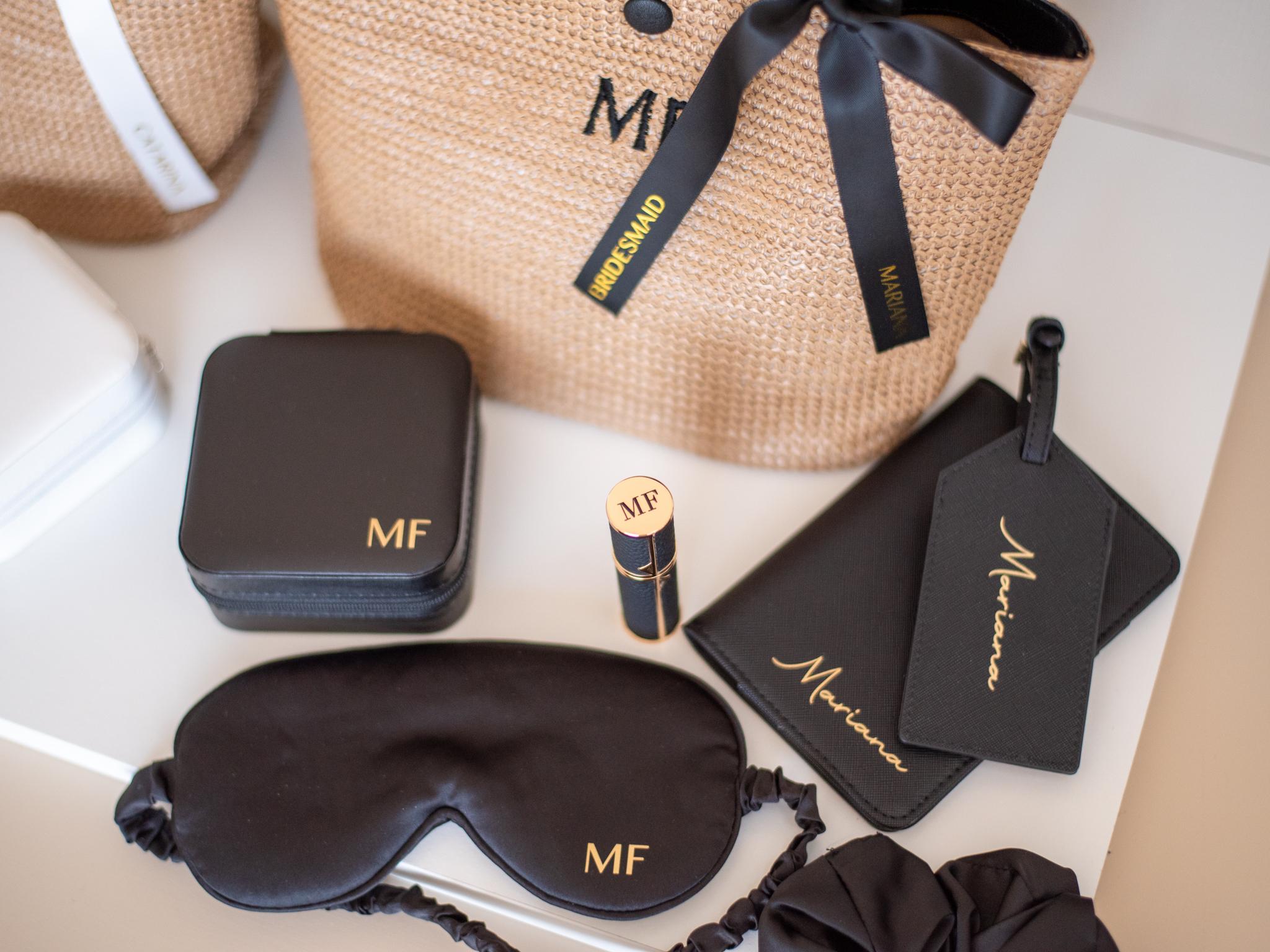 Máscara de Olhos, Scrunchie, Caixa de Joias, Atomizador de Perfume, Tote Bag | Presente para Cortejo Nupcial e Dama de Honor